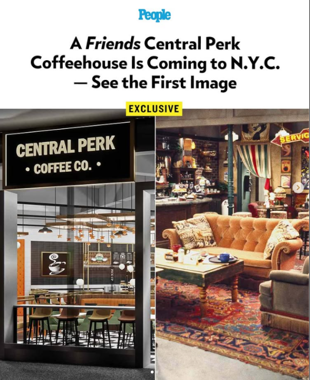 Μετά από διάφορα pop-ups σε όλο τον κόσμο και μία σταθερή τοποθεσία στην Βοστώνη, το Central Perk ετοιμάζεται να ανοίξει το πρώτο κατάστημά του με τοποθεσία την Times Square της Νέας Υόρκης. Θα αποτελεί μία ‘μοντέρνα βερσιόν’ του καφέ έτσι όπως το βλέπαμε στα επεισόδια του θρυλικού sitcom, ενώ στον κατάλογο θα βρίσκονται καφέδες, τσάγια και άλλα ροφήματα, καθώς και σνακ εμπνευσμένα από την σειρά. Ο βραβευμένος σεφ Τομ Κολίκιο έχει αναλάβει το μενού.