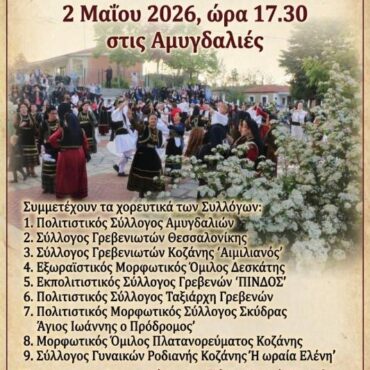 Πανηγύρι και αποχαιρετισμός της Πασχαλιάς Πρόσκληση στις Πολιτιστικές Εκδηλώσεις των Αμυγδαλιών Γρεβενών. Ο Πολιτιστικός Σύλλογος Αμυγδαλιών σας προσκαλεί να μας τιμήσετε με την παρουσία σας στις εκδηλώσεις: 1. Το Σάββατο 2 Μαΐου το πρωί, διοργανώνει σε συνεργασία με την Κοινότητα και την Εκκλησιαστική Επιτροπή το παραδοσιακό πανηγύρι στον Άγιο Αθανάσιο. Το πρόγραμμα των εκδηλώσεων περιλαμβάνει: Θεία Λειτουργία και αρτοκλασία. Το χορευτικό – λαογραφικό τμήμα των γυναικών του Συλλόγου και οι άλλες γυναίκες του χωριού θα χορέψουν και θα […]