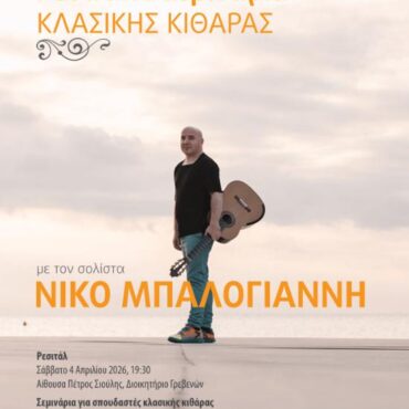 Ρεσιτάλ και Σεμινάρια Κλασικής Κιθάρας με τον διακεκριμένο σολίστα Νίκο Μπαλογιάννη Η Περιφερειακή Ενότητα Γρεβενών διοργανώνει για πρώτη φορά μια πολυήμερη μουσική δράση αφιερωμένη στην κλασική κιθάρα: ένα ρεσιτάλ υψηλού επιπέδου και μια σειρά εκπαιδευτικών σεμιναρίων (master class) για σπουδαστές κλασικής κιθάρας, με τον σολίστα Νίκο Μπαλογιάννη. Έξι μήνες μετά την πρώτη του εμφάνιση στην πόλη μας —στο αφιέρωμα για τον πατέρα του, αγιογράφο Γρηγόρη Μπαλογιάννη— ο Νίκος Μπαλογιάννης επιστρέφει στον τόπο καταγωγής […]